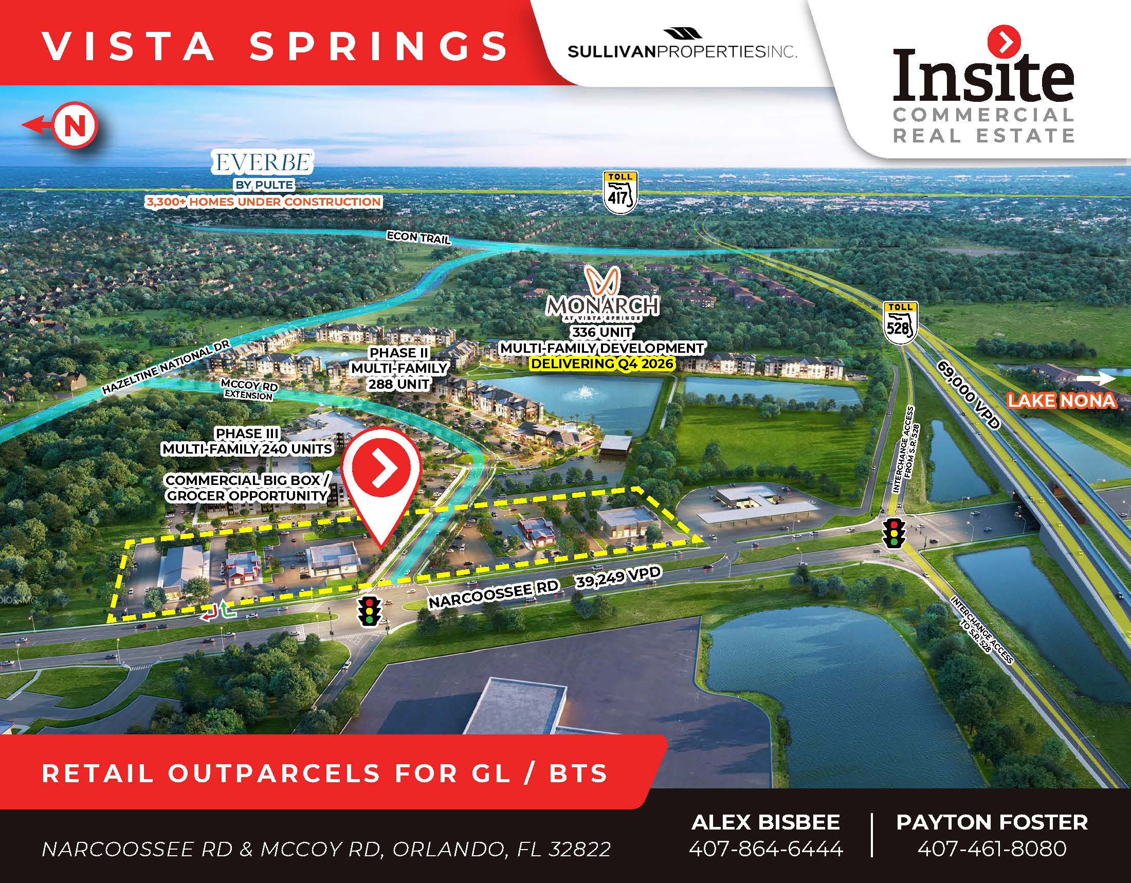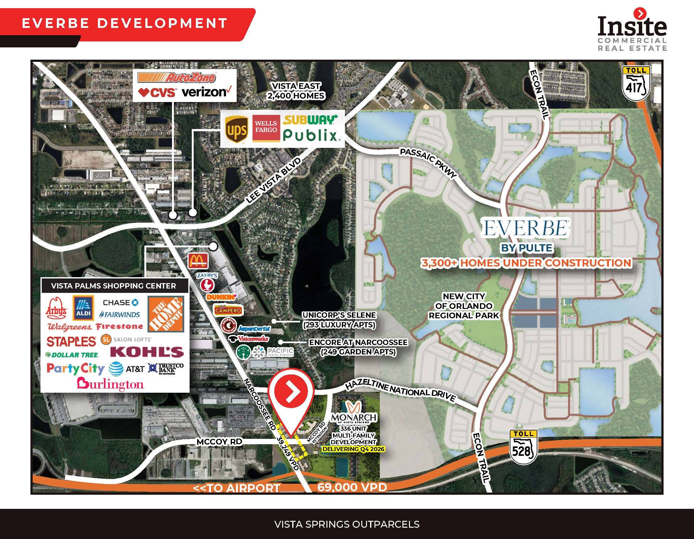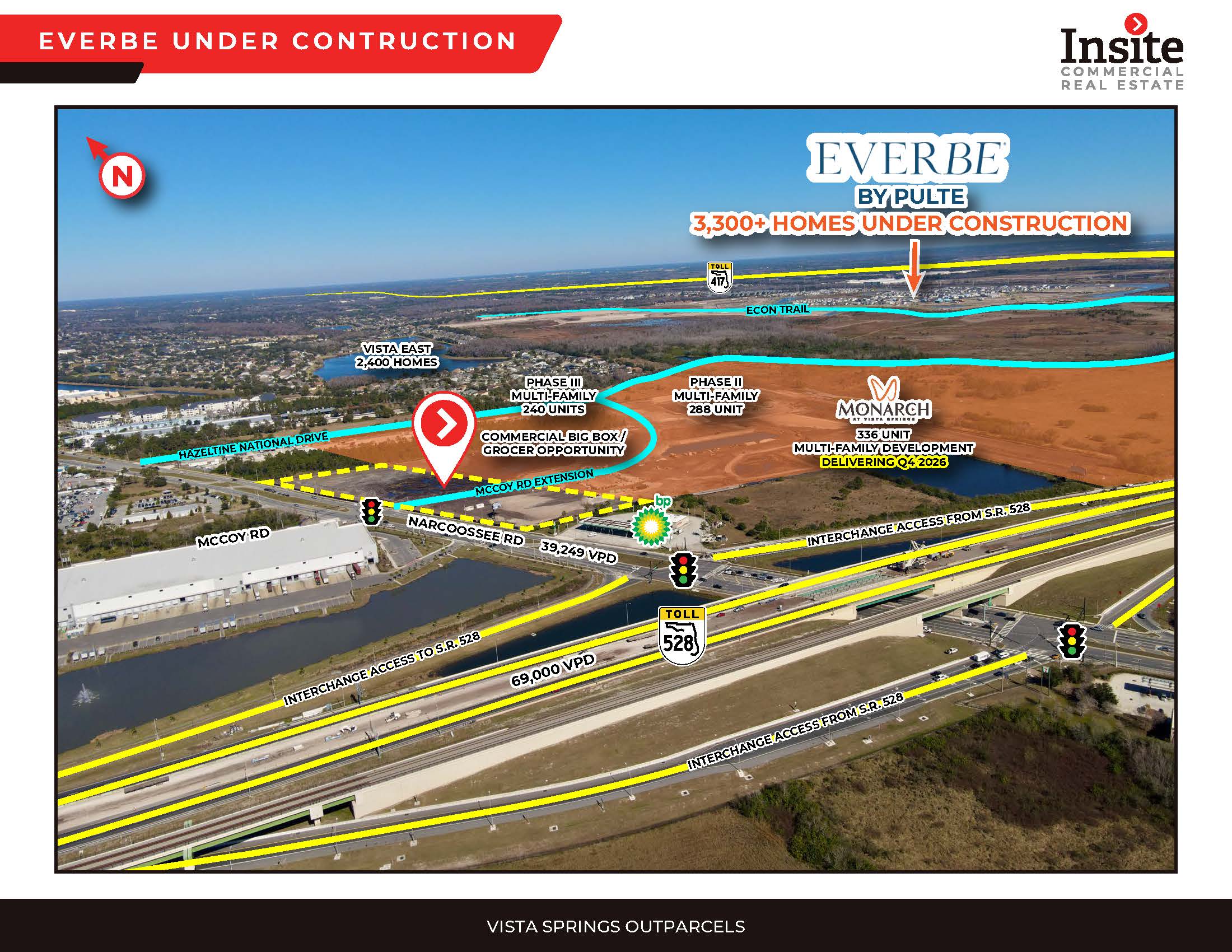 The Vista Springs outparcels will offer connectivity via McCoy Road to Pulte’s Everbe development, with additional access North to Lee Vista Boulevard through Econ Trail.